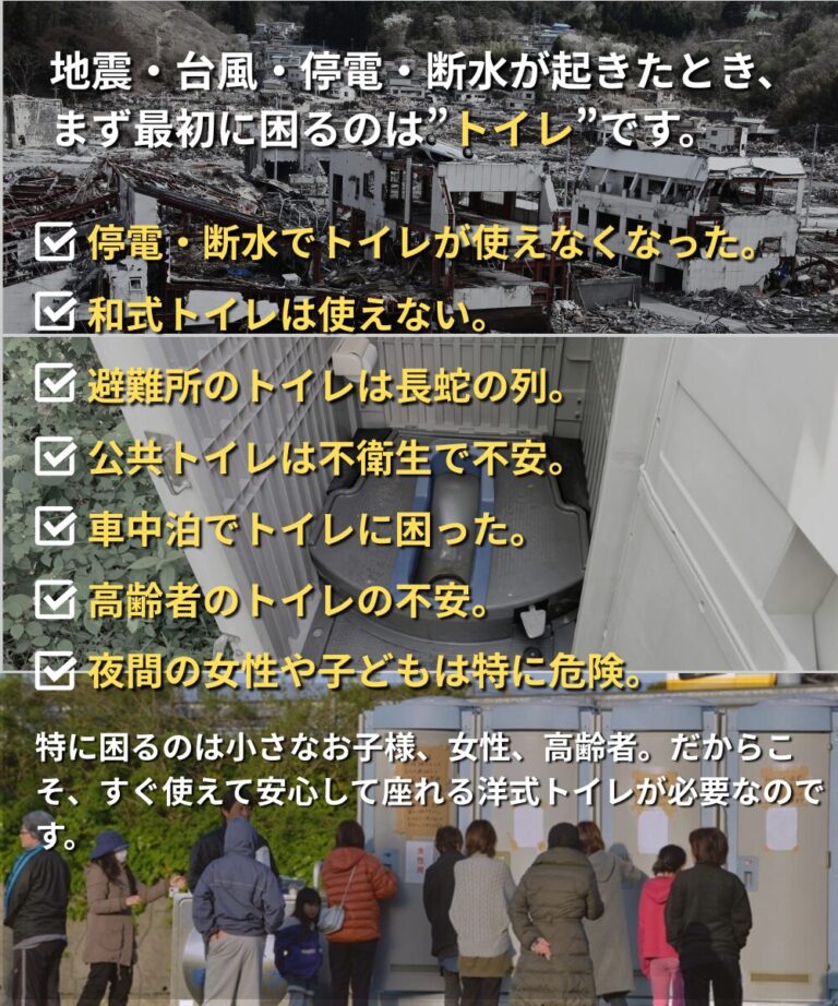 能登地震、熊本地震、東日本大震災のすべてでトイレ困難者が発生しました。